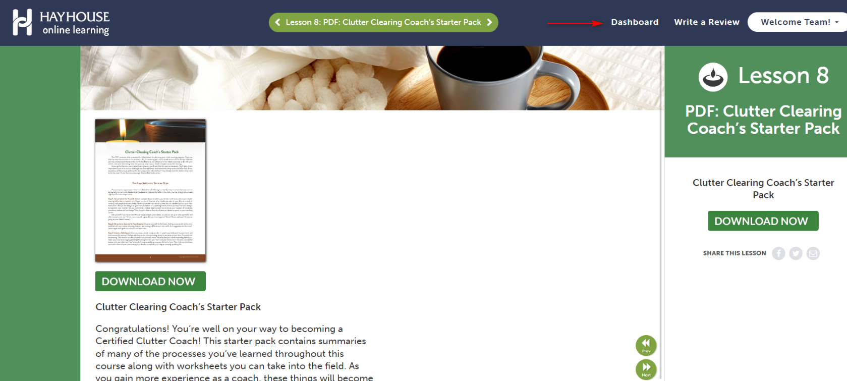 - After the video completes it will automatically redirect to the next section of the lesson. You can then click on ''Dashboard''.