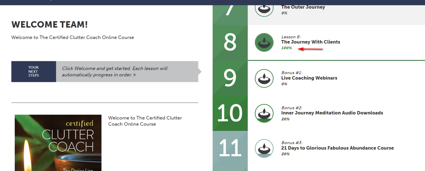 - After clicking on Dashboard, you can then scroll to the lesson that was incomplete. You will now see that the lesson is marked at 100%.