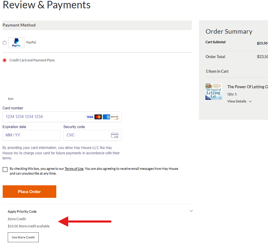 If you have store credit available on your Hay House account, you can use it during checkout to pay for eligible items. This article walks you through how to apply your store credit on HayHouse.com.